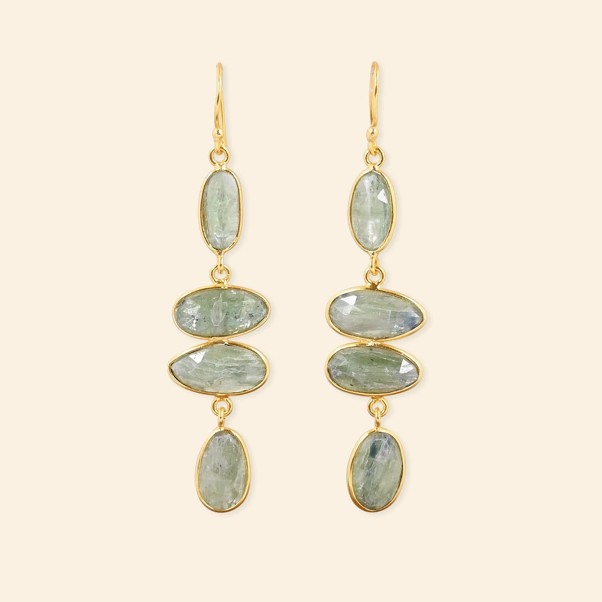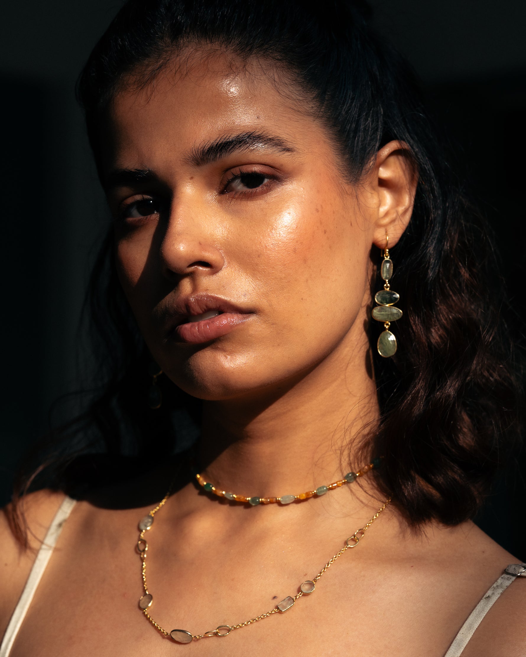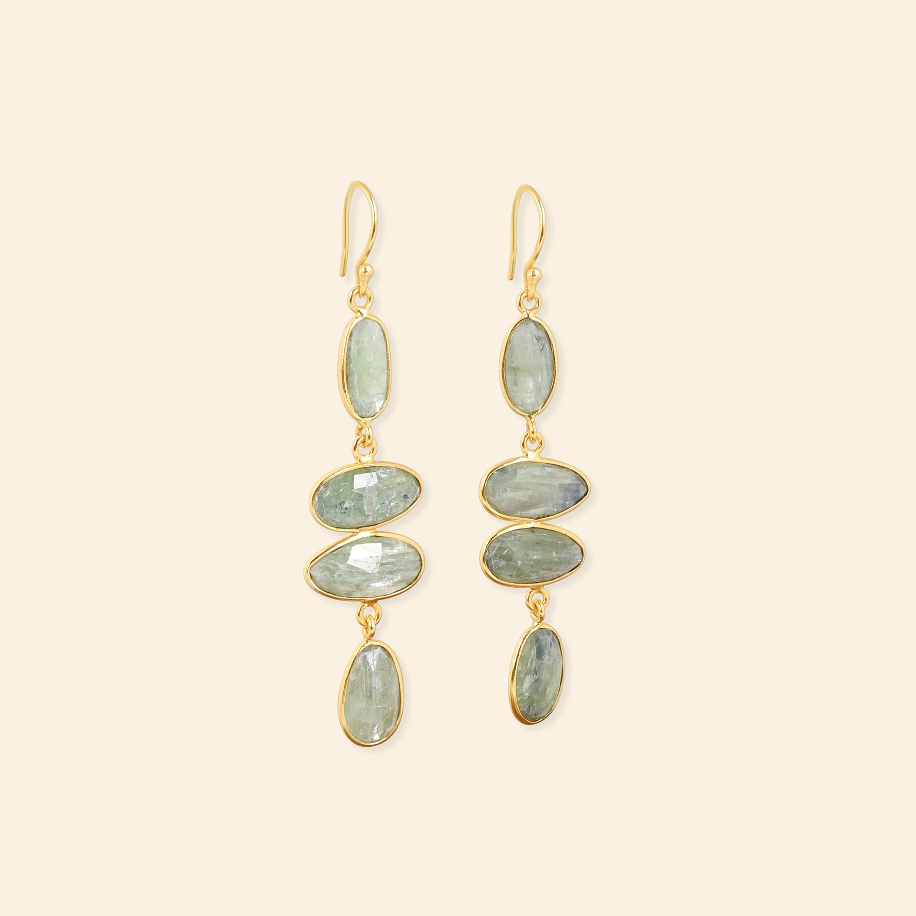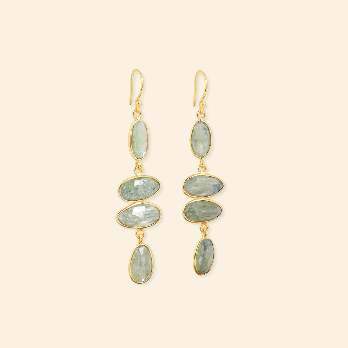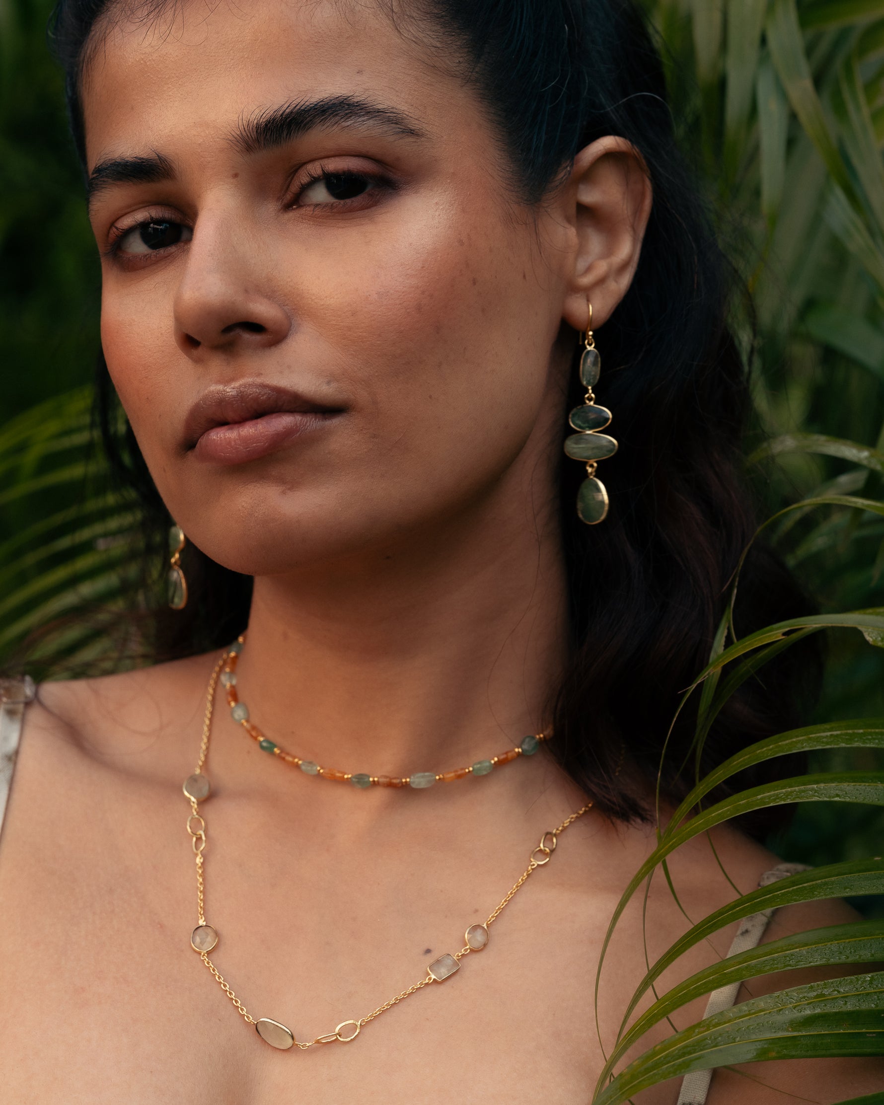 Drop earrings featuring either Rose Quartz, Green or Moss Kyanite, epitomizing the sacred garden keepers. These pieces unite Vrinda, whose divine garden Krishna honored by naming the holy Vrindavan, with Amenirdis, the God's Wife of Amun who tended the sacred gardens of Thebes. Whether in gentle Rose Quartz of Vrinda's flowering paradise, or verdant Moss Kyanite reflecting Amenirdis's temple gardens.
