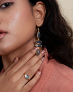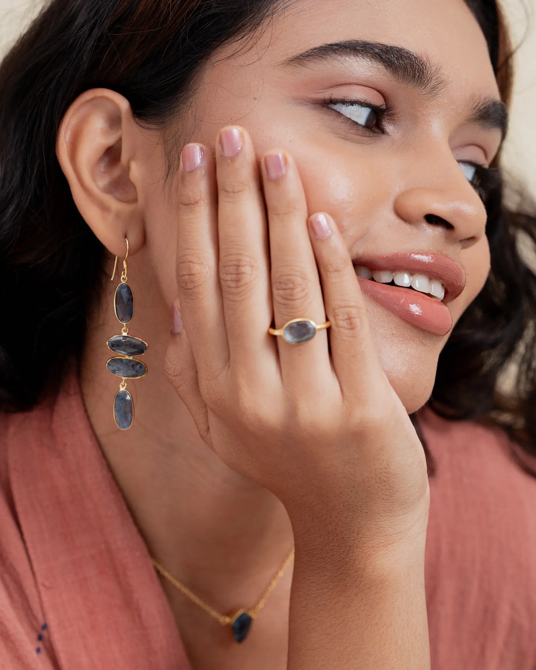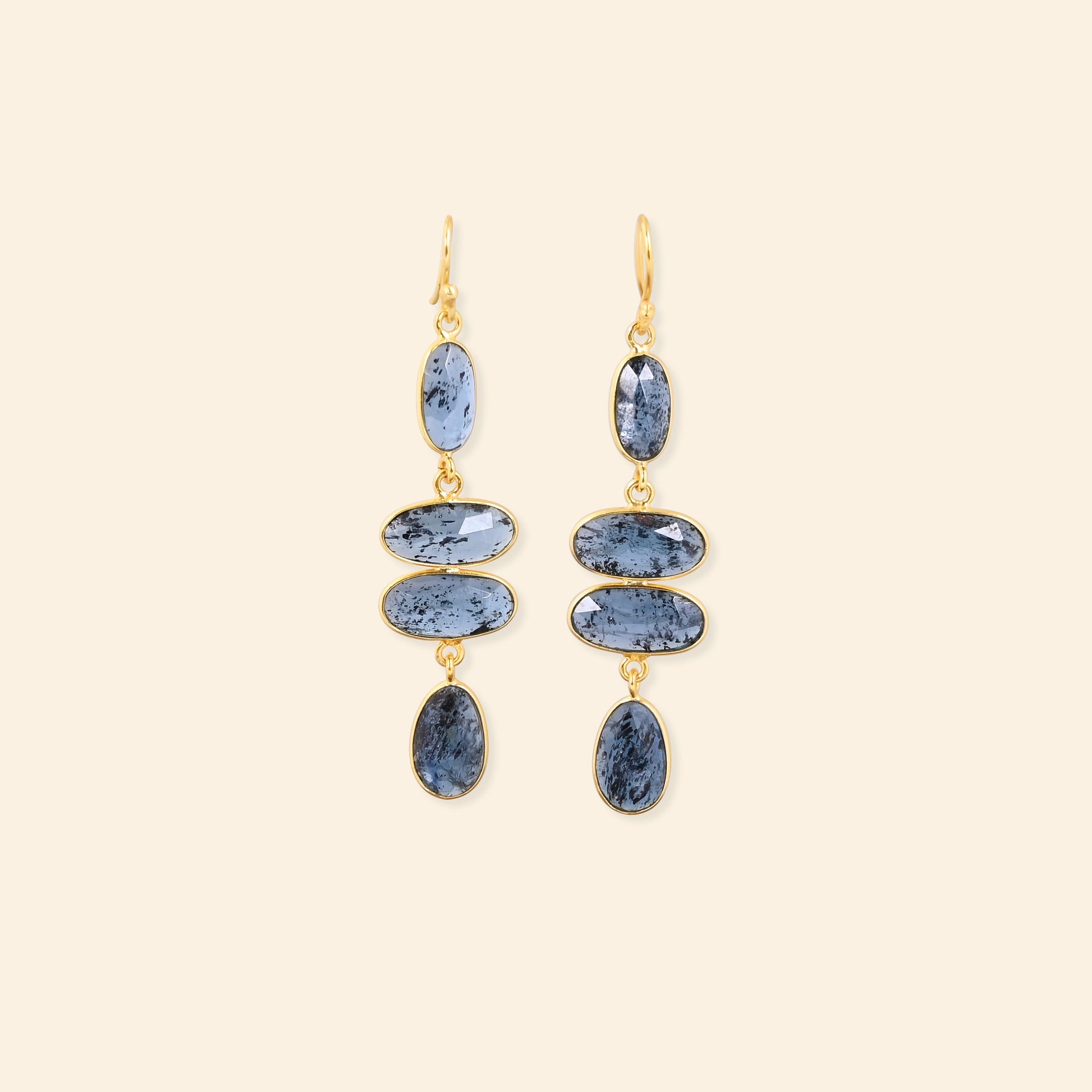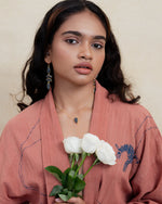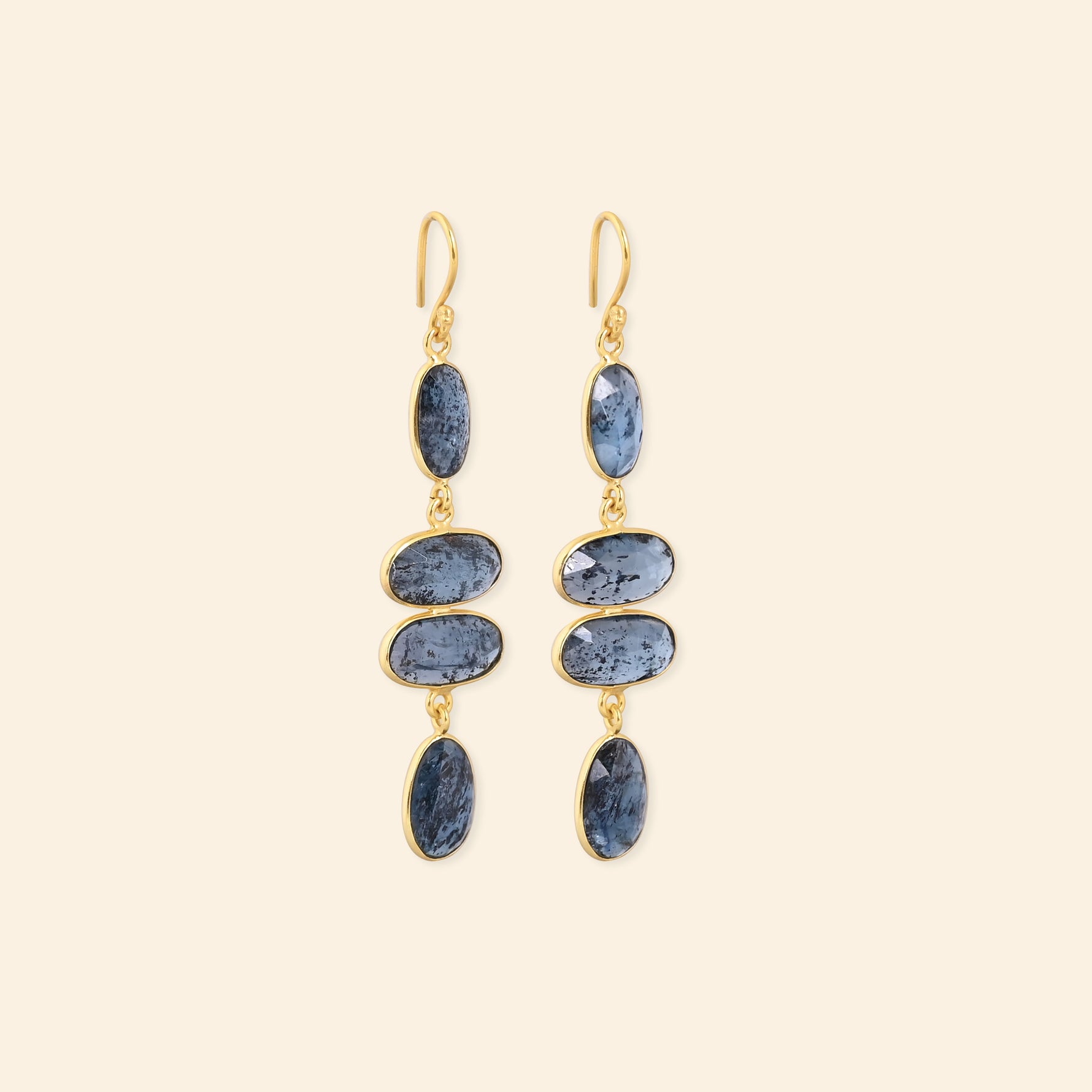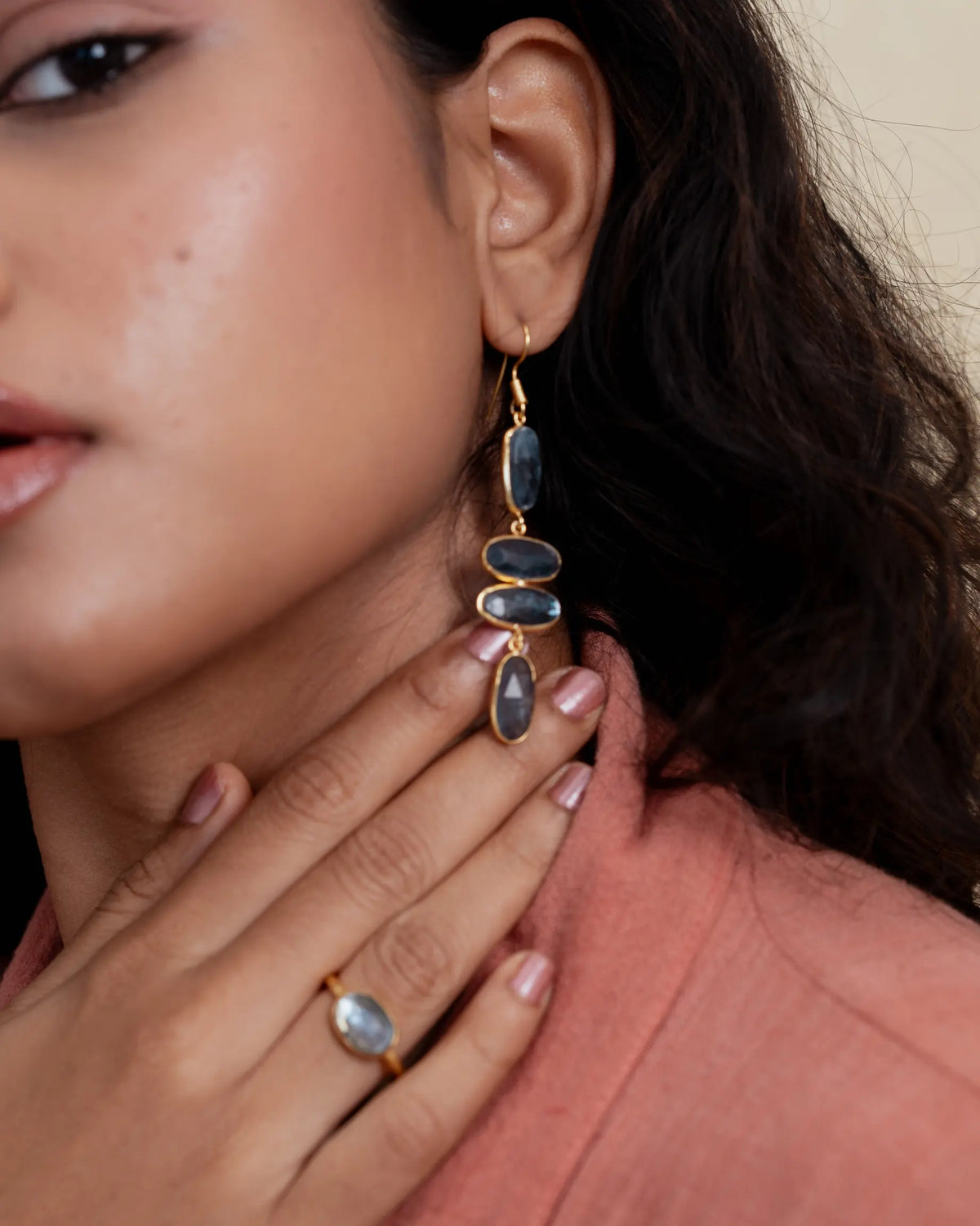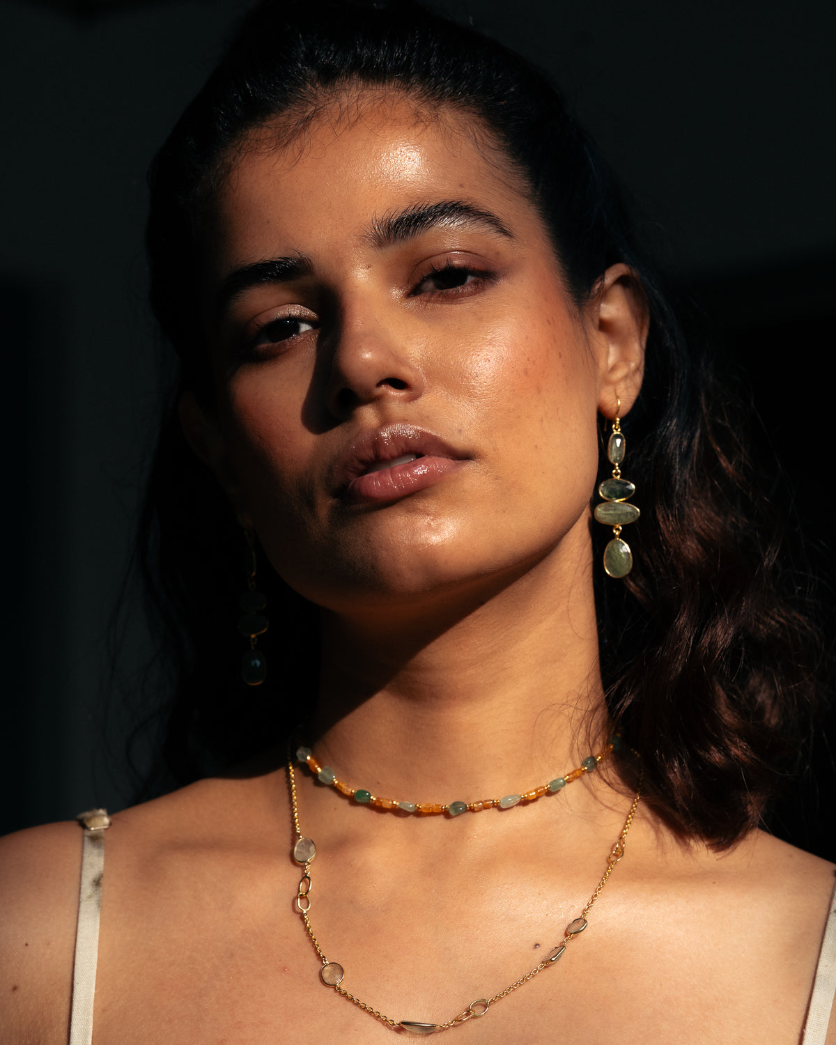 Drop earrings featuring either Rose Quartz, Green or Moss Kyanite, epitomizing the sacred garden keepers. These pieces unite Vrinda, whose divine garden Krishna honored by naming the holy Vrindavan, with Amenirdis, the God's Wife of Amun who tended the sacred gardens of Thebes. Whether in gentle Rose Quartz of Vrinda's flowering paradise, or verdant Moss Kyanite reflecting Amenirdis's temple gardens.