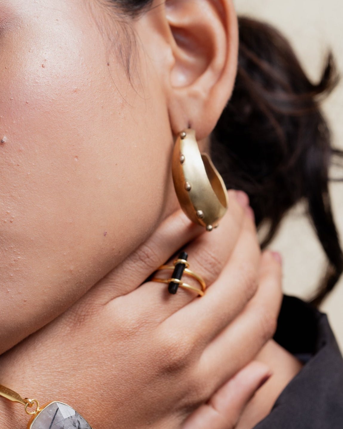 Our gold jewelry is hand-crafted in 18K gold on brass. To avoid oxidization of the gold plating, avoid extended direct contact with water, cleaning solutions and perfumes. For best care, store your jewellery in the provided original packaging.