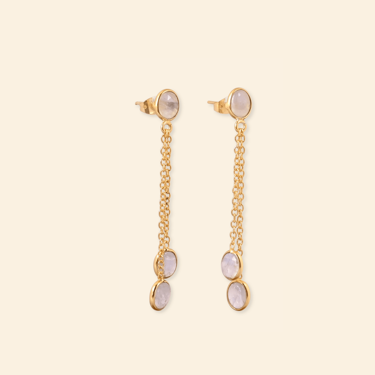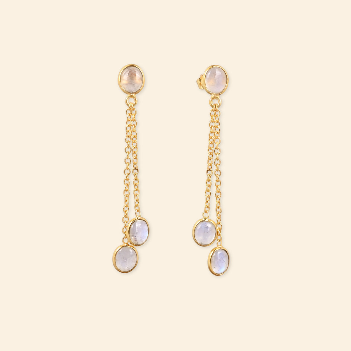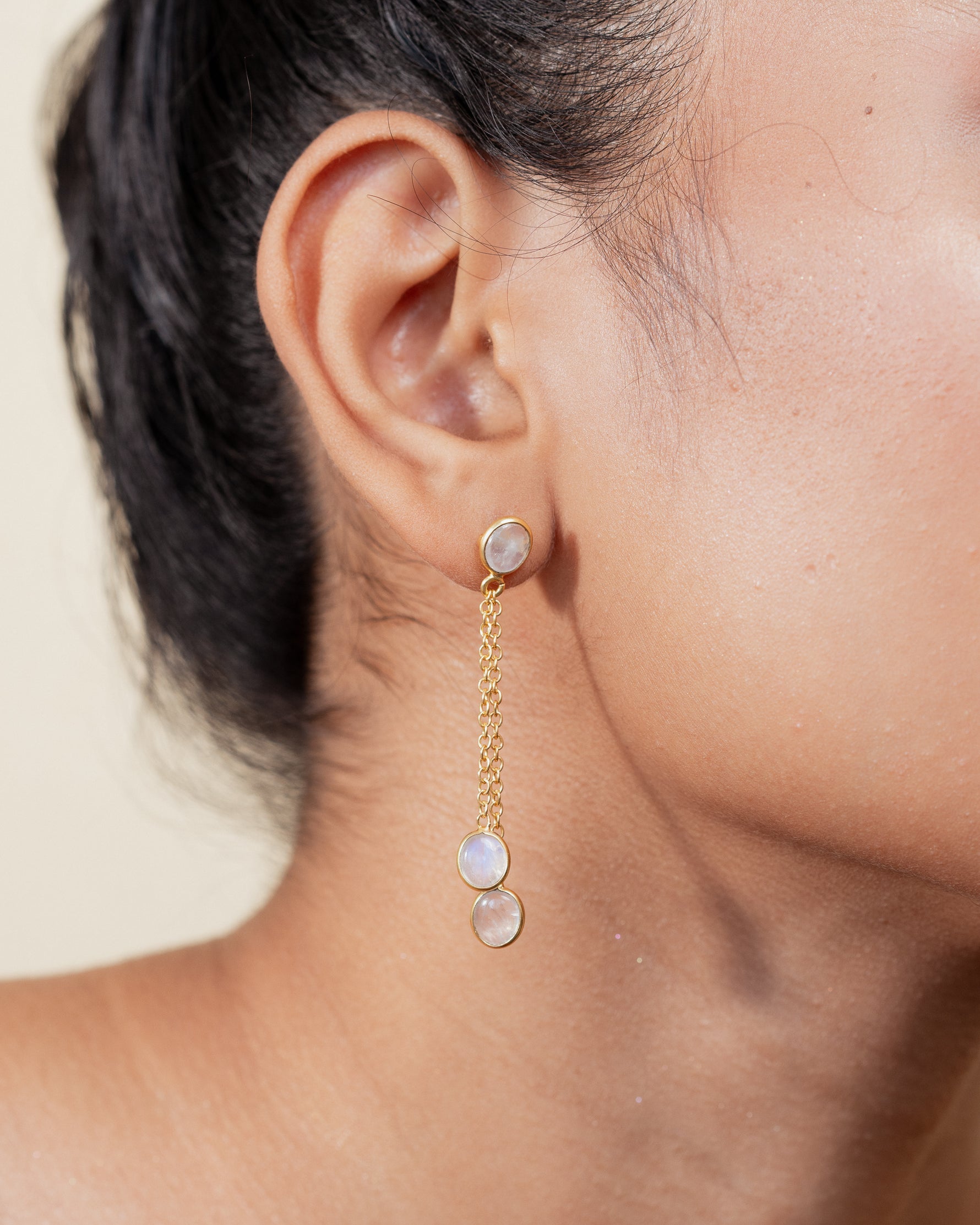 Double-drop earrings featuring Rainbow Moonstone, celebrating celestial timing and patience. These pieces unite Revati, who waited eons for the perfect moment to descend from the celestial realms for love, with Henutmire, the Egyptian princess-priestess who waited years to become divine consort. The luminescent Moonstone suggests Revati's stellar origins and Henutmire's connection to lunar rituals. Each piece represents Revati's descent through time and Henutmire's rise through ranks.
