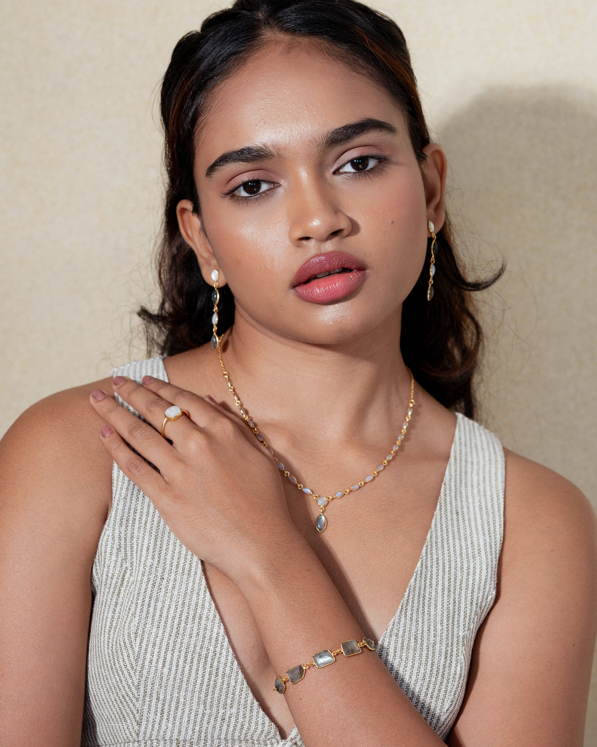 Natural semi-precious stones have been used to make your jewellery pieces. Every gemstone is unique and will have slight variations in size, colour, shape and inclusion compared to the ones displayed on the website.