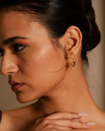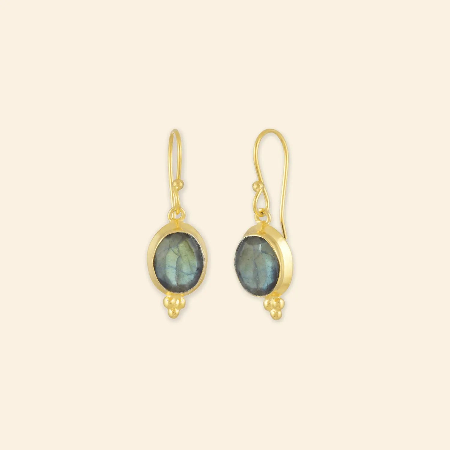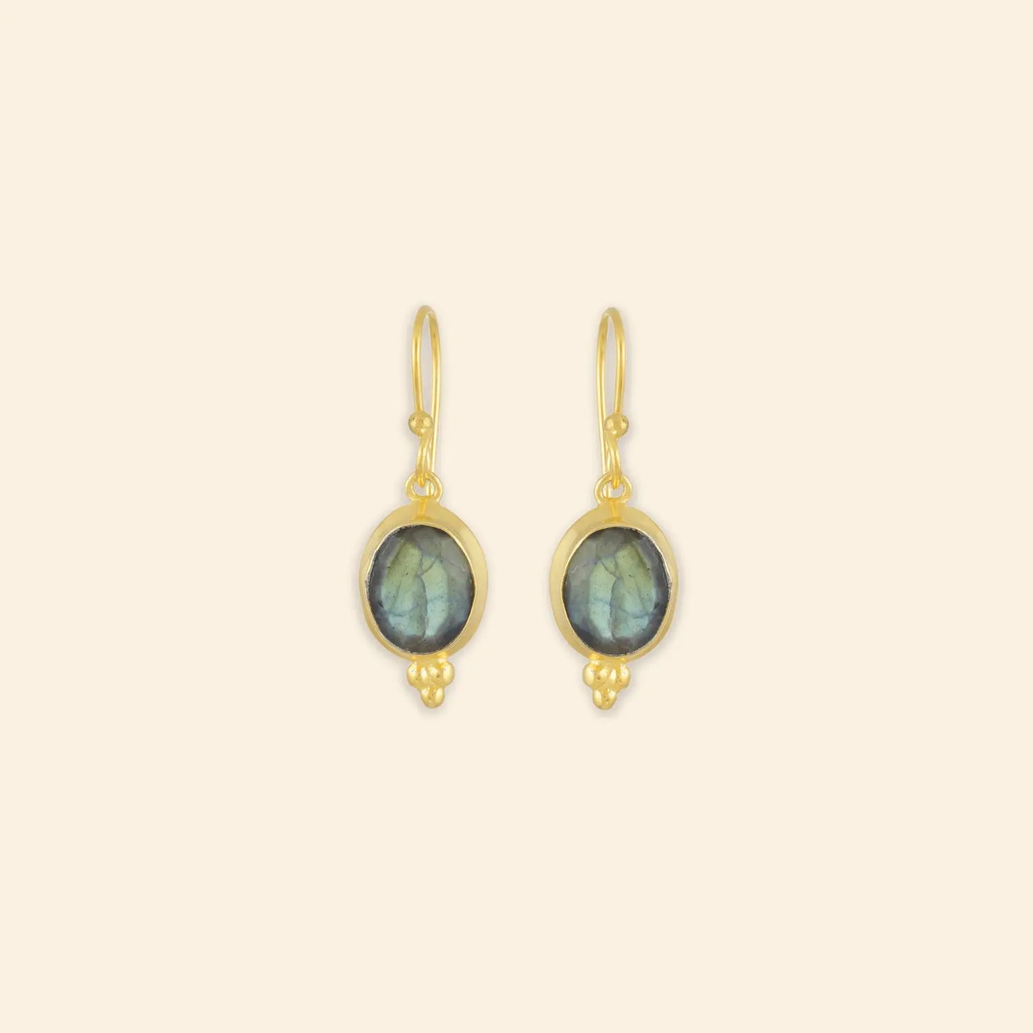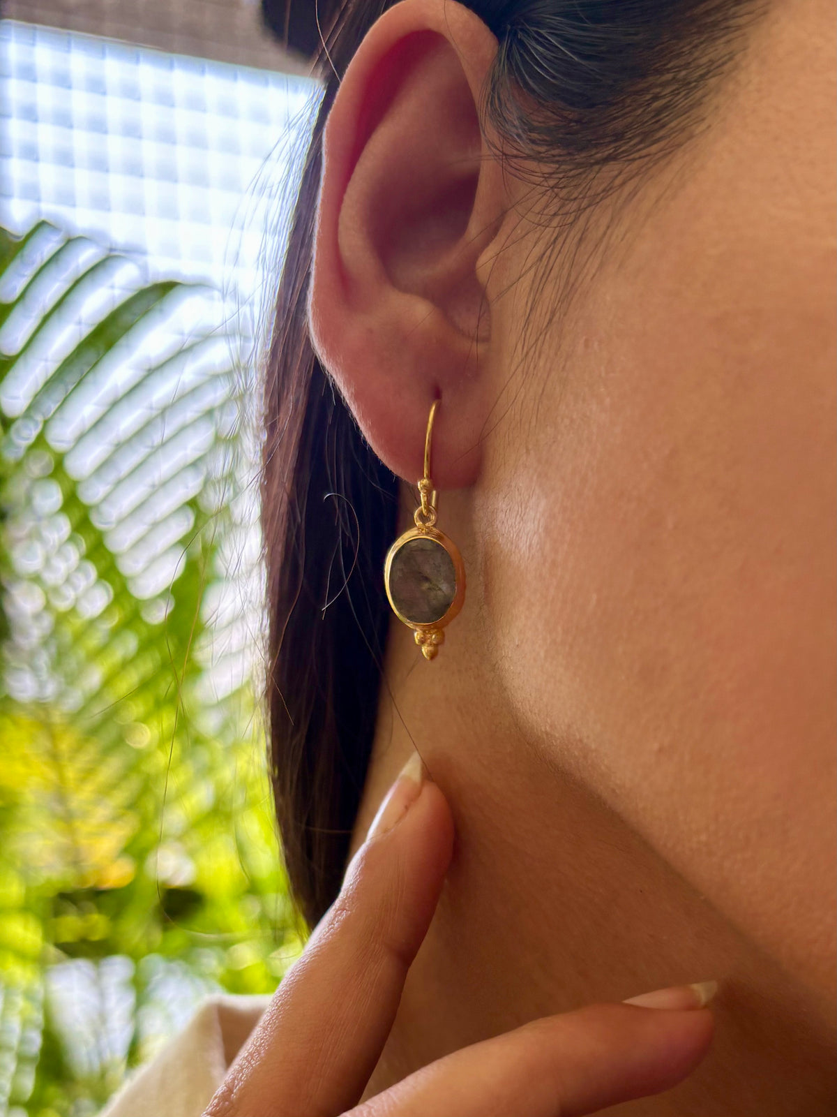 Inspired by the fleeting beauty of an eclipse, these earrings frame Labradorite’s shifting hues in a sleek, circular form. The oval-cut stones catch light with every movement, revealing hidden flashes of blue and gray. Finished with delicate gold bead details, bringing a refined yet effortless charm.
