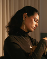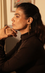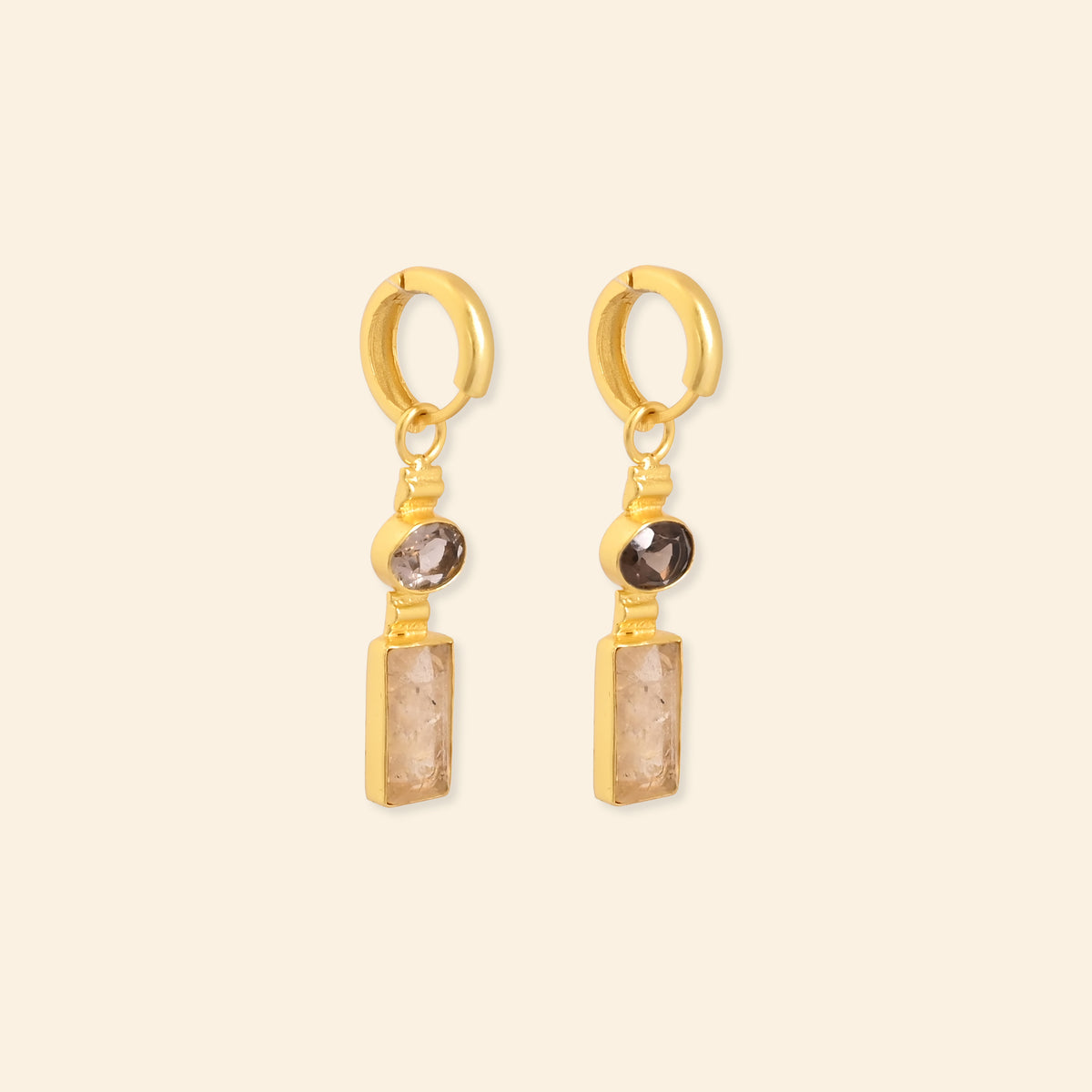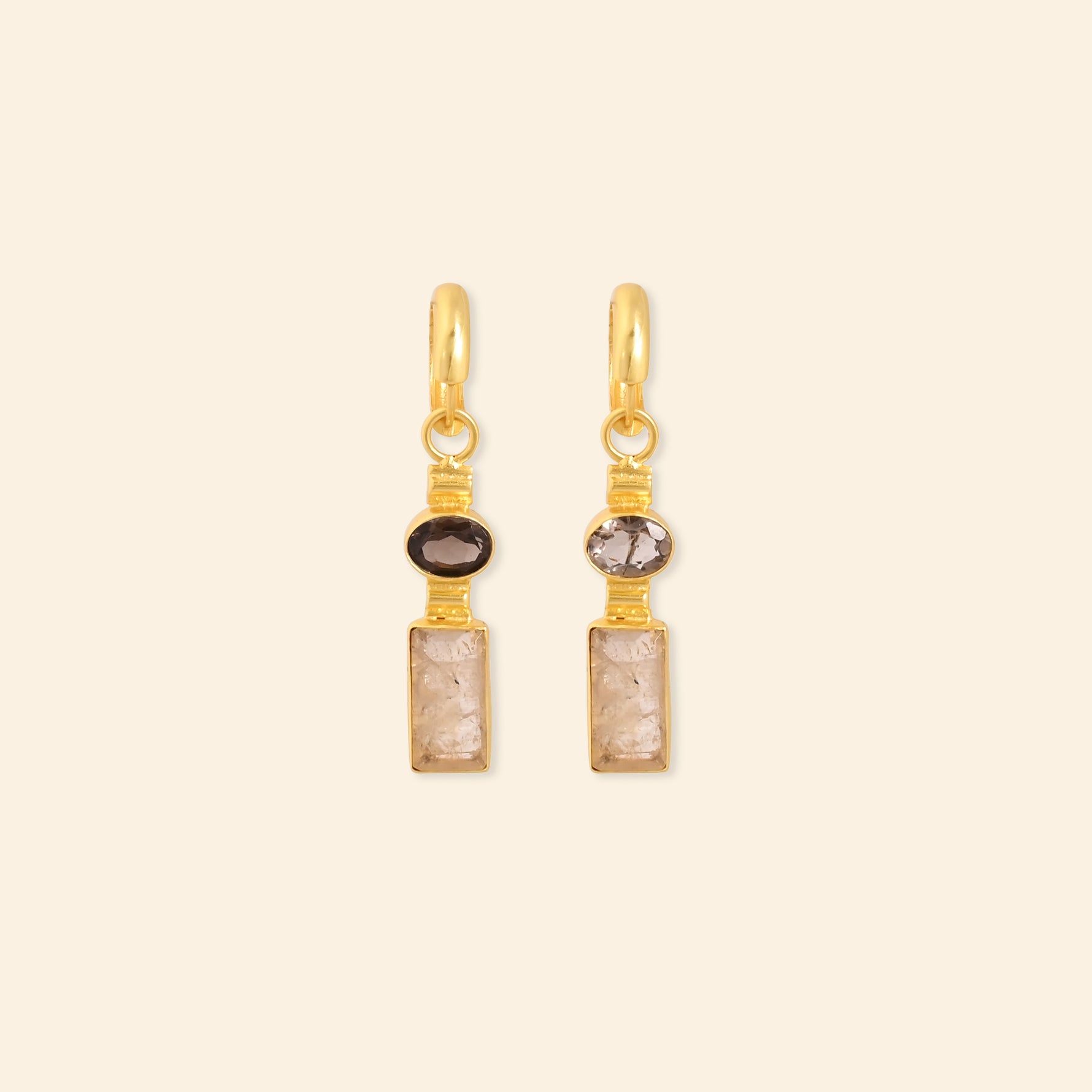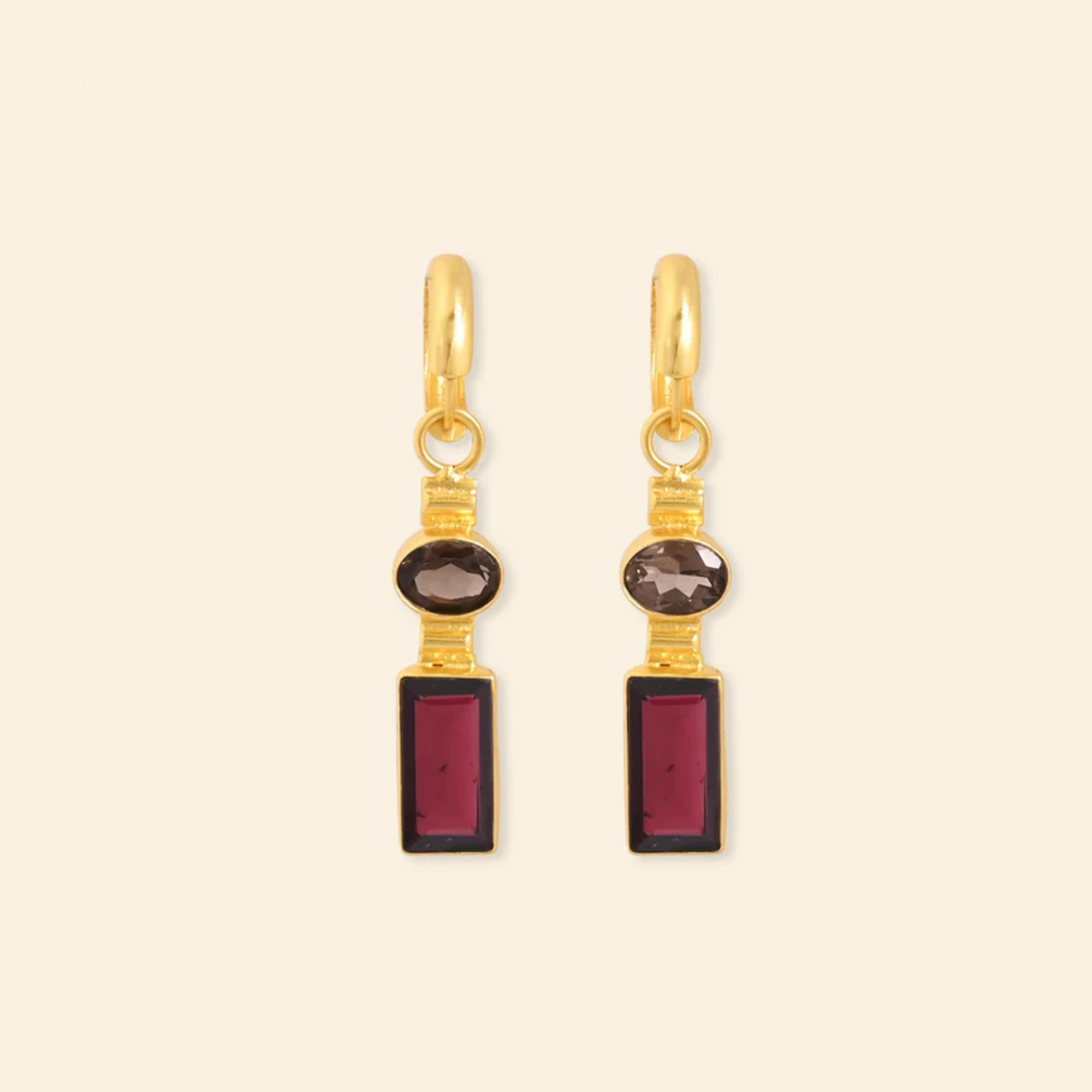 Garnet pulses with deep passion, Smoky Quartz steadies, and Citrine sparks radiance. These linear earrings temper wildness with form, a dance between abandon and grace. Inspired by Dionysus, divine disruptor and joy incarnate, and Rati, goddess of irresistible delight, this design celebrates ecstatic control. A geometry of gold holding emotional fire, like ritual held within rhythm. For those who break rules with elegance, and turn every gaze into invitation - radiant, unshaken, and always just out of reach.