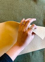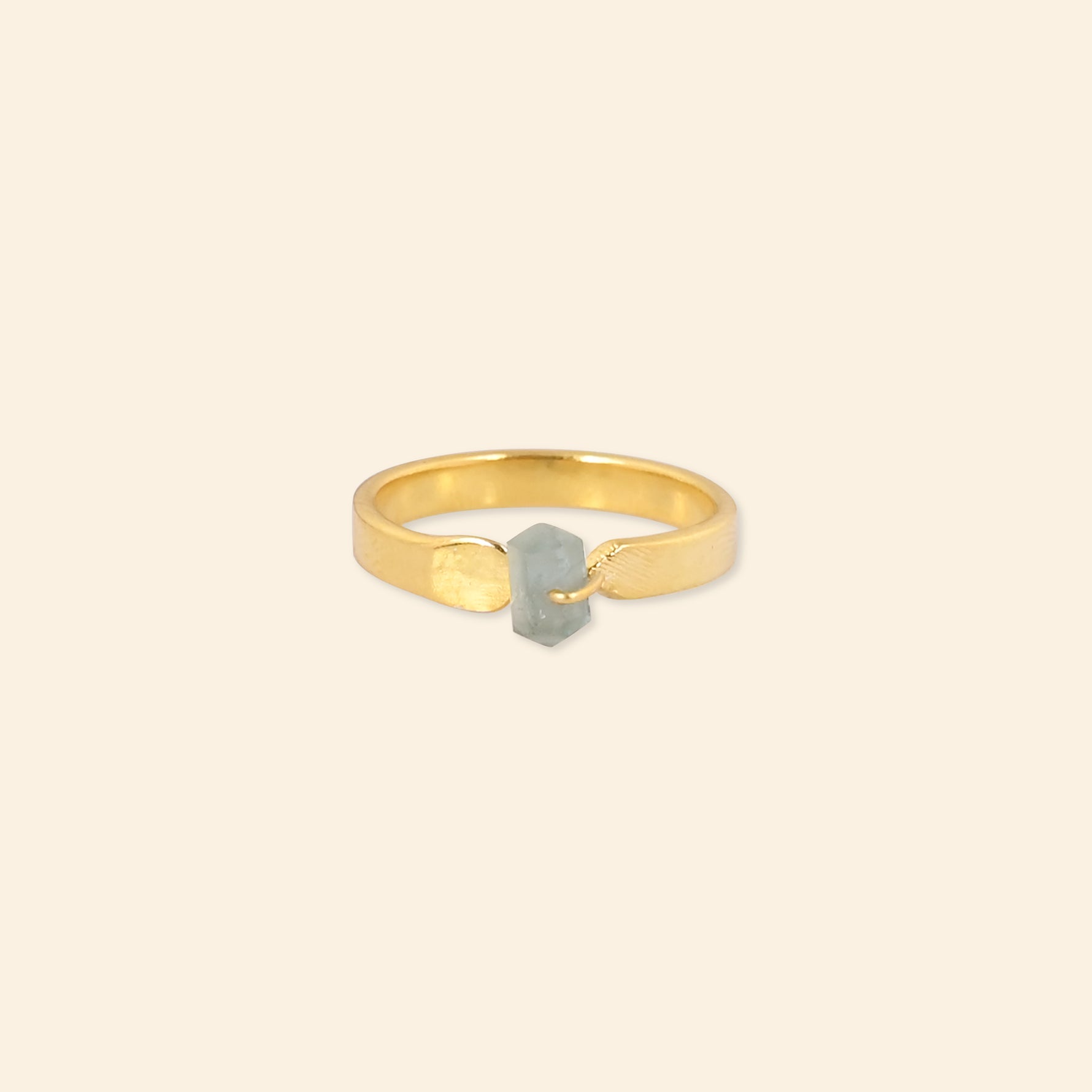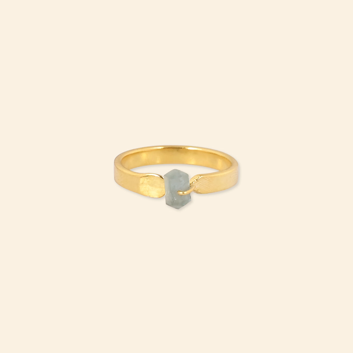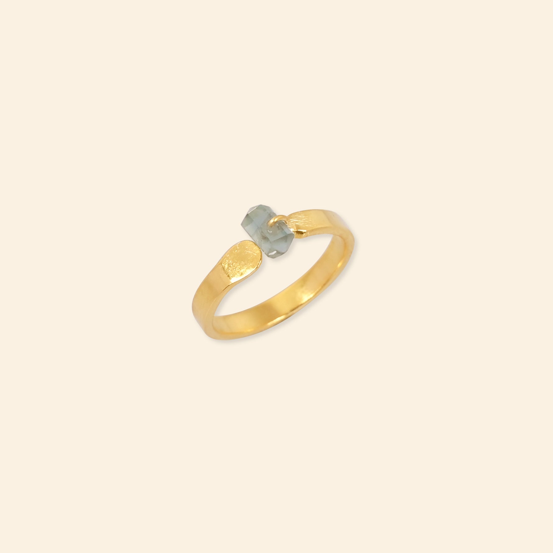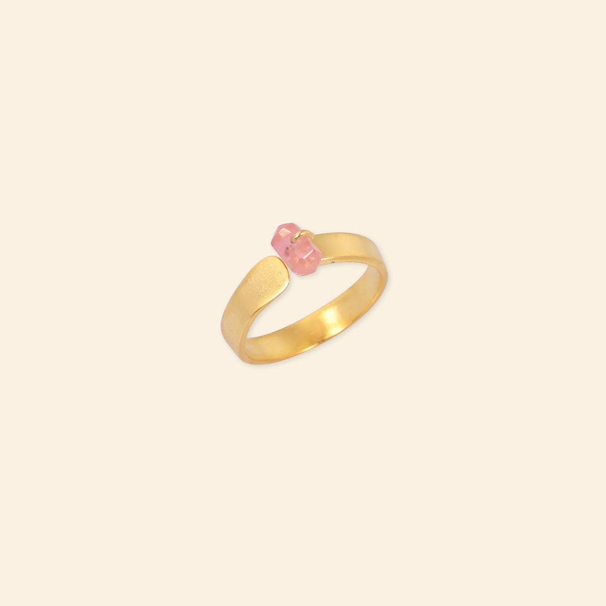 Crafted in captivating Apatite and Cherry Crackle, the ring embodies the poetic tension between stillness and spark. The cool, oceanic Apatite reflects Sarasvatī, goddess of knowledge and rivers; flowing with serene wisdom, purity, and unbroken rhythm, much like the ring’s fluid gold form and its raw, untouched cut. In contrast, the Cherry Crackle, with its fiery veins and delicate blush, channels Athena’s intellect and inner fire, a warrior’s mind wrapped in calm strategy, echoing the ring’s bold opening and organic asymmetry. The ring celebrates clarity that guides and power that flows with grace.