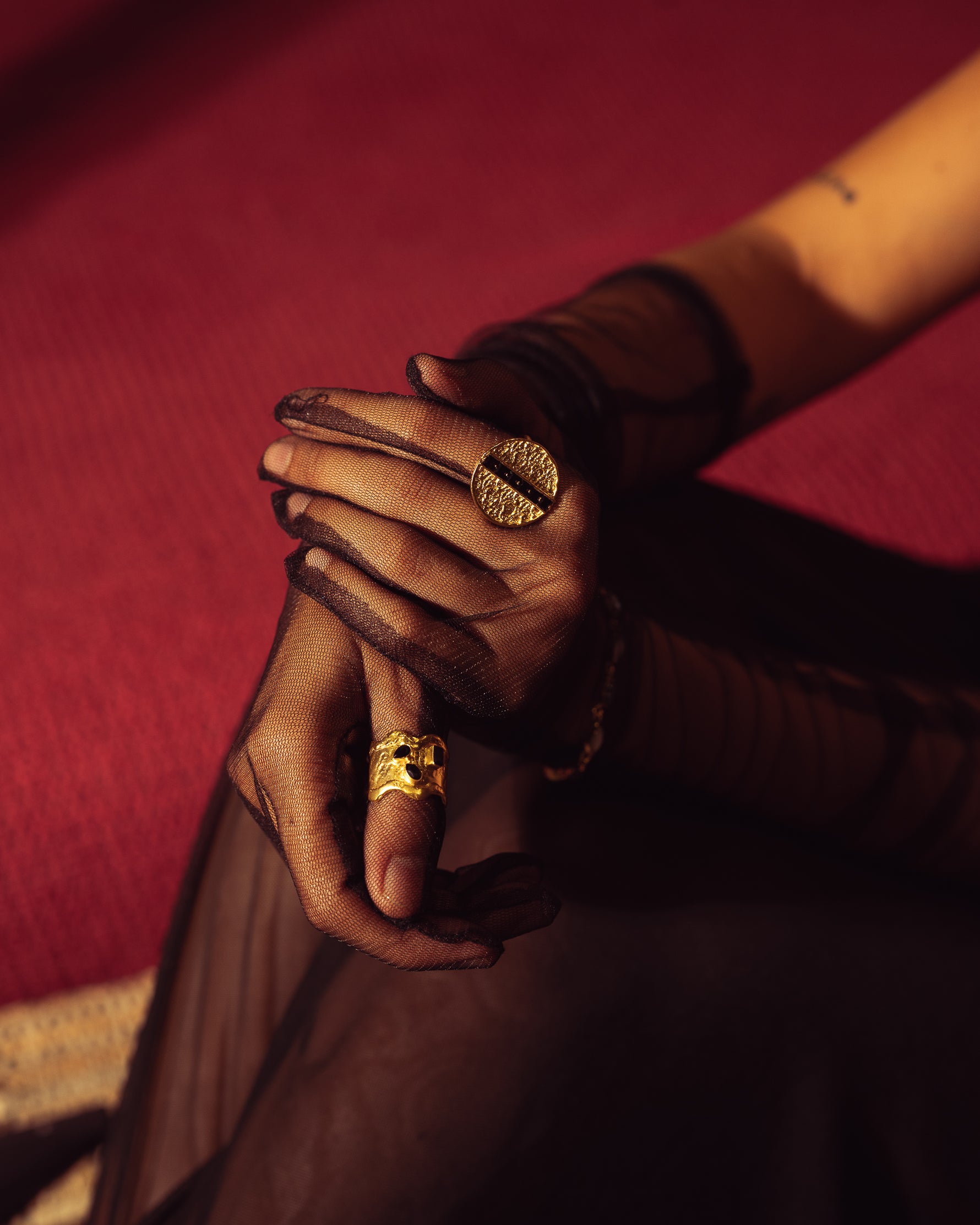 Kali Crest draws its strength from two parallel mythic forces; Kali’s fearless clarity and Nyx’s sovereign night. each shaping the design’s bold, molten form and the grounding black onyx. Inspired by Kali, the onyx becomes a symbol of cutting through illusion with fierce positivity, while the sculpted gold echoes Nyx’s horizon of deep intuition and quiet cosmic authority. Together they inform a statement piece that represents liberation, inner command, and a powerful, protective elegance. crafted for someone who leads with conviction and carries both fire and shadow as sources of strength.